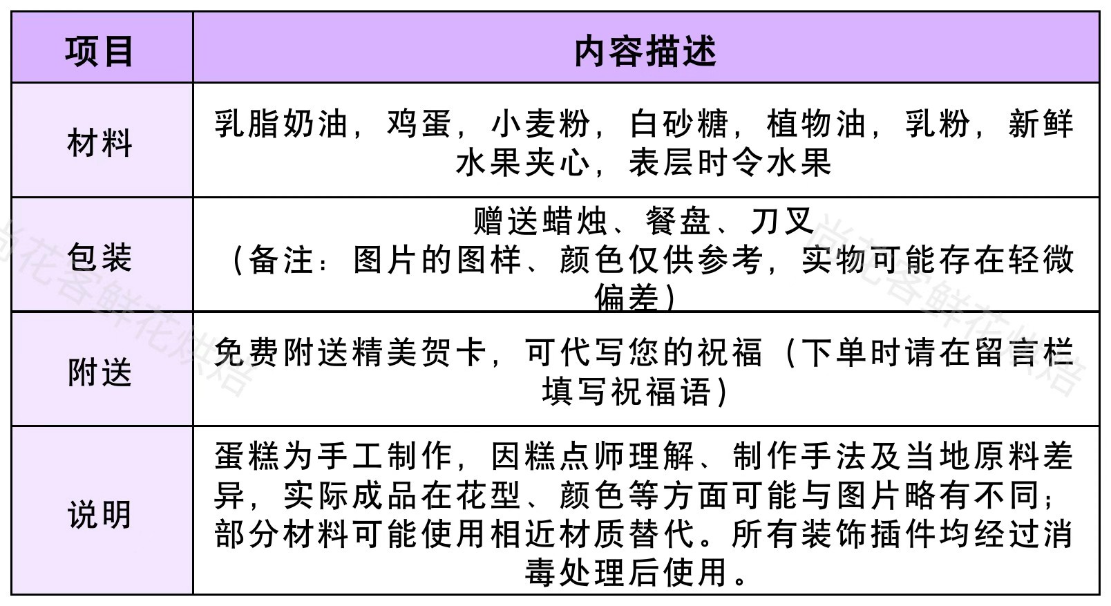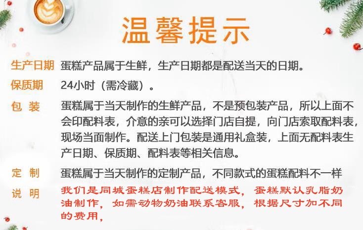 蛋糕乃手工制作产品,不同的糕点师对图片上花型的理解不同以及制作手工不同,另外受当地原料因素等原因影响,当某些材料和颜色缺乏时,我们会以相近的替代,收货人实际收到的产品可能与网页上看到的图片存在一些差异(蛋糕尺寸均为英寸介意慎拍)。